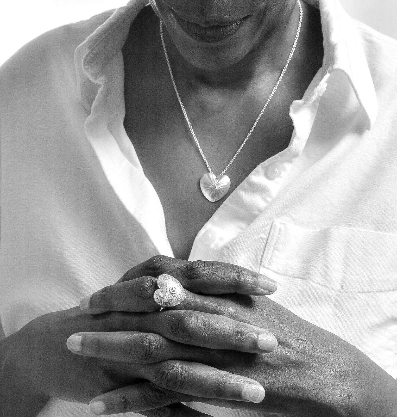 .925 Silver hand-formed heart with Top White SI1 Diamond (2.4mm). Hand-engraved on vintage Rose Engine. Shown on 18K Gold beaded ring band. Size 6