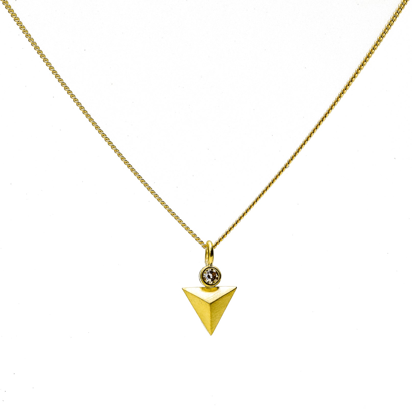 Award winning jewelry designer, Maria Samora's Tetrahedron Pendant is made of 18k Gold adorned with a single diamond. Hand made in Taos, New Mexico.